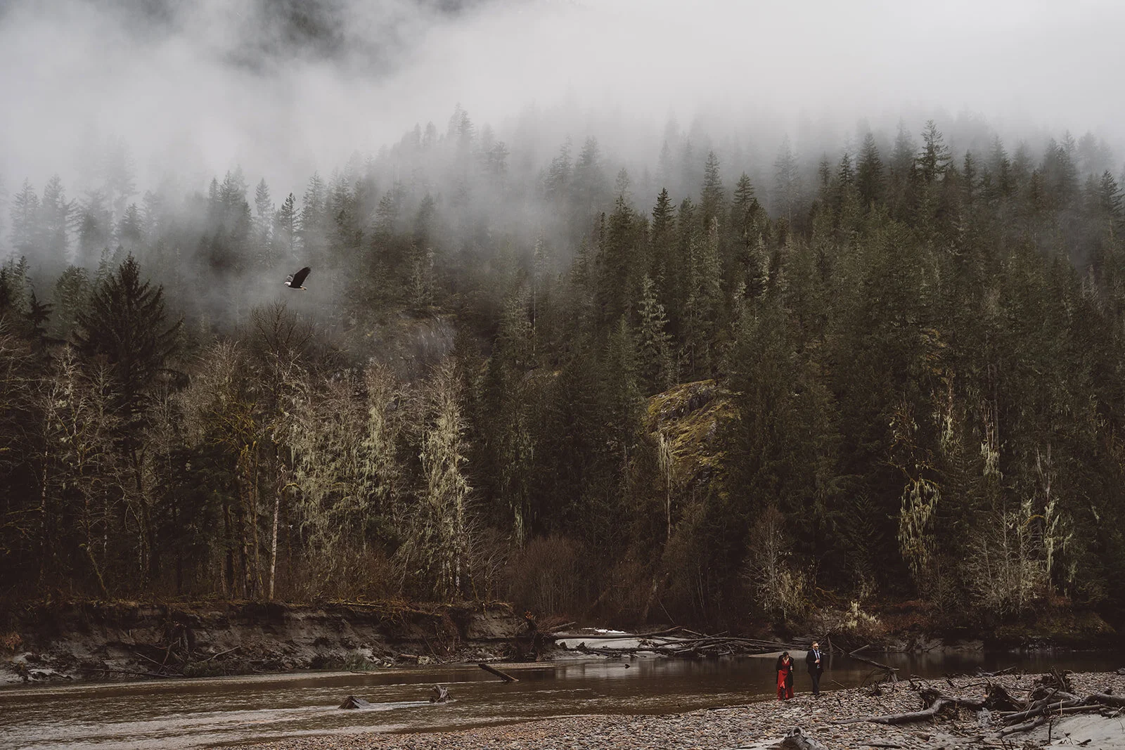There is beauty in every weather! We cannot stress this enough, a planned sunny glacier elopement can last-minute turn into a rainy, moody river elopement ft eagles and low-lying clouds. Respect mother nature, she knows what she’s doing, let go of any expectations and be thankful. As long as you are prepared with the right gear, the day will be incredible because you are finally eloping with your best friend!