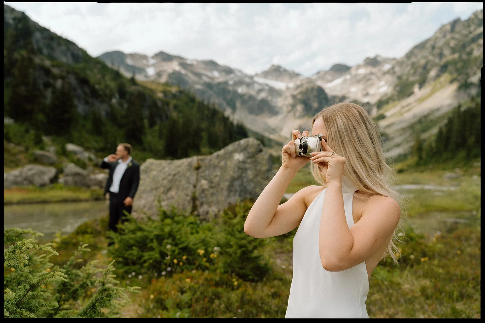 This was such a last minute decision to head up into Brandywine Meadows in Whistler for Emma & Beau’s Elopement but I am so glad it happened. Beau drove the three of us and two of their closest friends up a tricky 4x4 road in their little suv and then we hiked up to the valley together. These two genuinely took off down the trail and Emma with her hair down didn’t even break a sweat. It definitely showed that they are incredibly fit and love adventuring together in the mountains. They actually had summited Brandywine Meadows last summer and that was why they ended up picking the meadows for their ceremony.